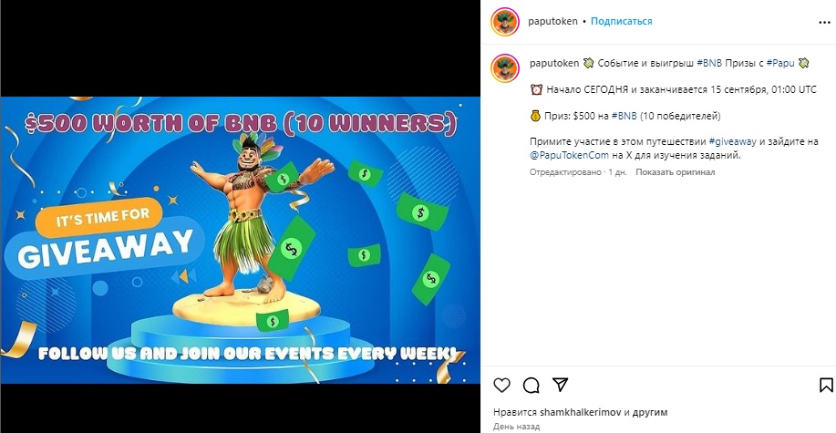 - Инстаграм Papu Token (@paputoken) — 532 подписчика. На данный момент проходит Giveaway с розыгрышем 500$, будет выбрано 10 победителей.