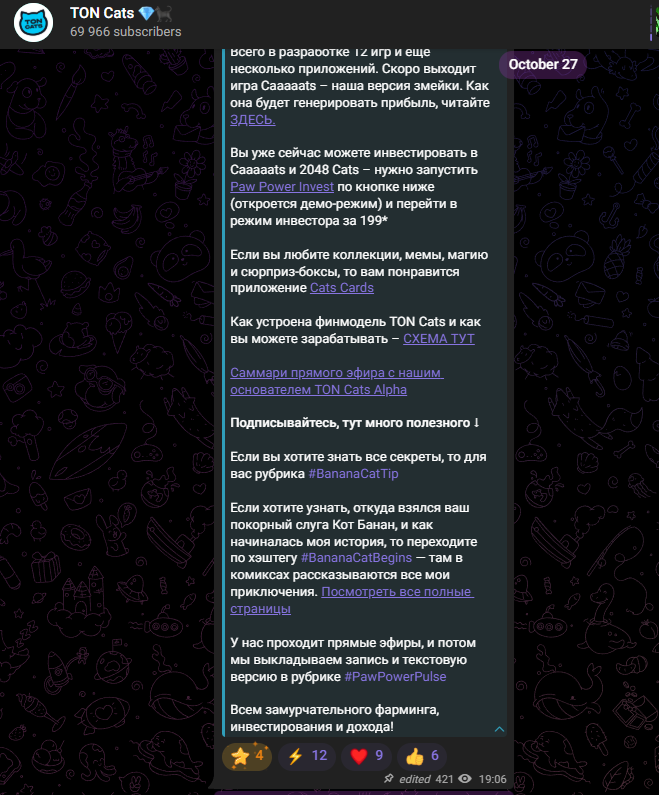 • Телеграмм канал TON Cats — 70 000 подписчиков;