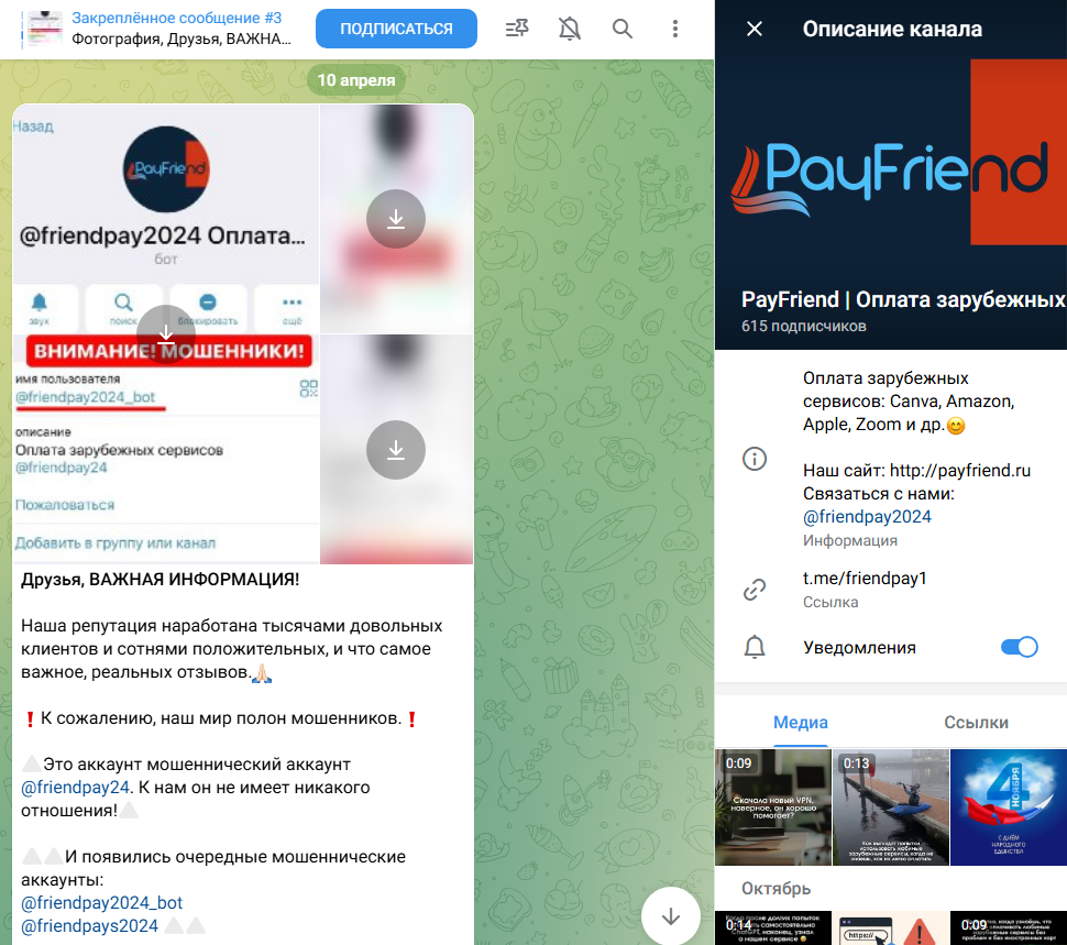 Работает по ссылке @friendpay1 с 2023 года. Имеет всего 600+ подписчиков. Активность низкая — за ноябрь всего 17 постов, просмотров по 100-300, что вдвое меньше аудитории. Возможно, канал накручивали ботами.