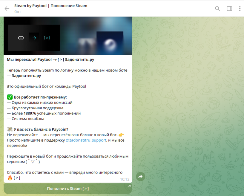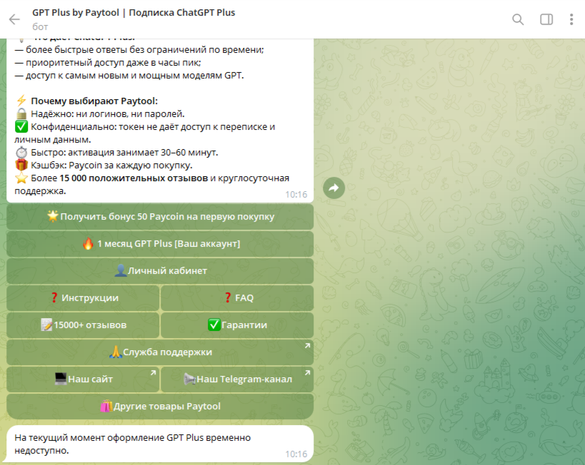 Покупка происходит не напрямую на сайте, юзера перенаправляет в телеграмм-бот. В зависимости от сервисов и доната в играх, перенаправления могут быть запутанными. Например, при попытке пополнить Steam клиента переносит в тг-бот @paytool_steam_bot, где предлагается перейти в еще один бот, и только потом оплатить товар.В paytool_hub_bot разработчики «ПэйТул» сделали более десяти тг-ботов под каждую категорию отдельно. Подобное решение придется по вкусу не всем пользователям, так как подразумевает появление новых дополнительных чатов в мессенджере вместо оплаты в одном месте. У сервиса бывают технические проблемы, в этом случае бот оповещает о том, что оформить подписку невозможно.
