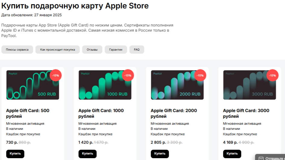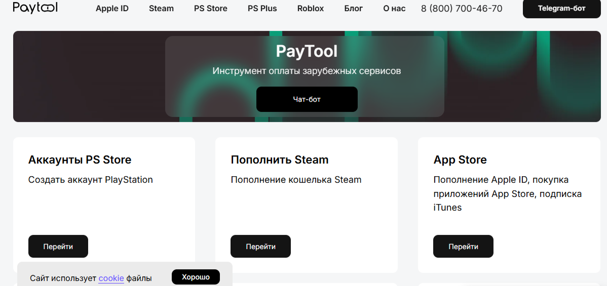 Сервис функционирует на сайте PayTool ru, где есть возможность сразу оплатить наиболее популярные услуги: осуществить донат в играх, оформить подписки на Steam, PS Store, сервисы Apple и так далее.
