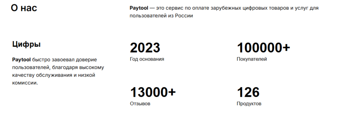 В разделе «О нас» указано, что платформа была основана в 2023 году, а ее создателем является человек по имени Даниил Фам. Администрация заявляет, что у Pay Tool более 100 000 клиентов и свыше 13 000 отзывов.
