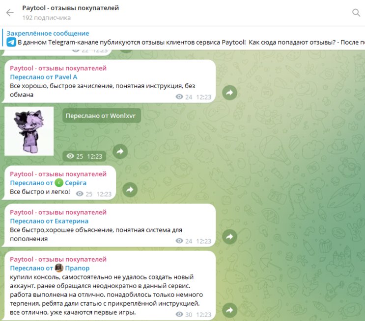 Компания очень гордится отзывами своих клиентов, в PayTool ru bot есть ссылки на них. Отдельный канал @paytool_reviews действительно имеет тысячи откликов, так как каждый пост там – это пересланное сообщение с похвалой в адрес сервиса. Такие мнения не являются для нас показательными, так как в свой телеграмм-канал администрация вряд ли будет постить жалобы и критику, поэтому обратимся к независимым ресурсам.