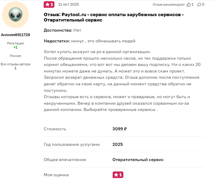 На сторонних площадках репутация сервиса действительно благоприятная. Средние оценки стремятся к «пяти звездам», пользователи отмечают надежность и оперативность работы системы. Нам удалось найти и негативные отзывы о «ПэйТул». Например, один из раздосадованных пользователей заявил, что оплатил покупку аккаунта в PS Store, но не получил содержимое. Неизвестно, смог ли юзер вернуть свои деньги.