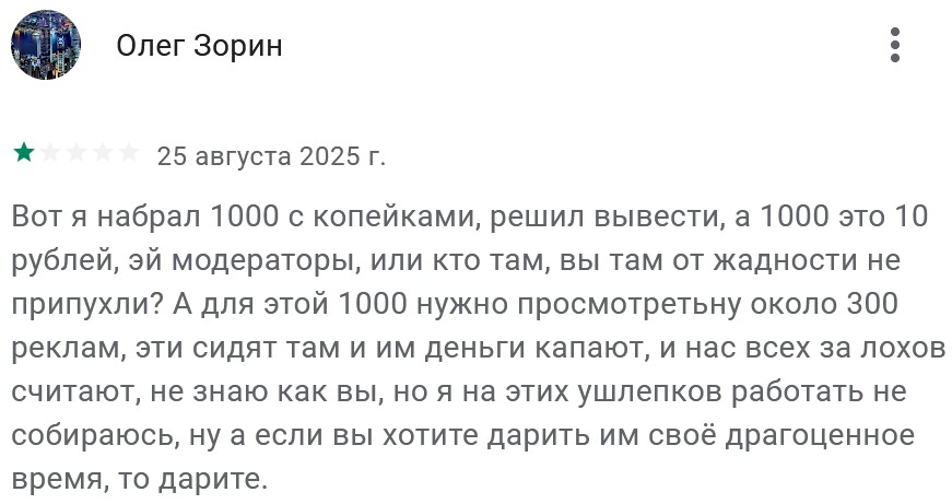 Вложения в игру действительно не требуются, а монетизируется он только рекламой, которую игроки вынуждены просматриваться за любое действие в приложении. Минимальная сумма для вывода составляет 1000 игровых монет, что эквивалентно 10 рублям.