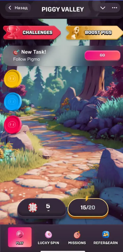 Главный экран игры называется «Piggy Valley». Яркая мультяшная графика в стиле фэнтези-долины. Тропинка ведет через лес к замку. По краям разбросаны цветные кнопки для разных действий.