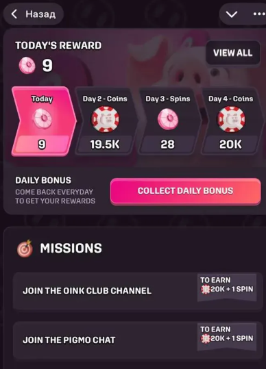 Колесо фортуны в Тг «Пиг» – центральный элемент монетизации проекта. Разделено на сектора с разными призами. Можно выиграть монеты, дополнительные спины или мультипликаторы.