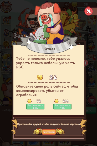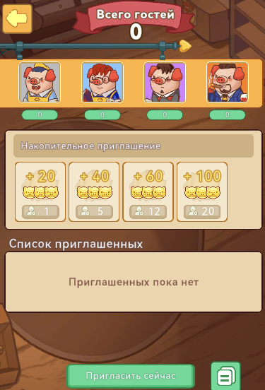 Также дополнительный доход в Piggy Piggy дают рефералы. За привлечение определенного количества друзей дают золотые монеты. Чем больше приглашено гостей, тем значительнее объем премии.