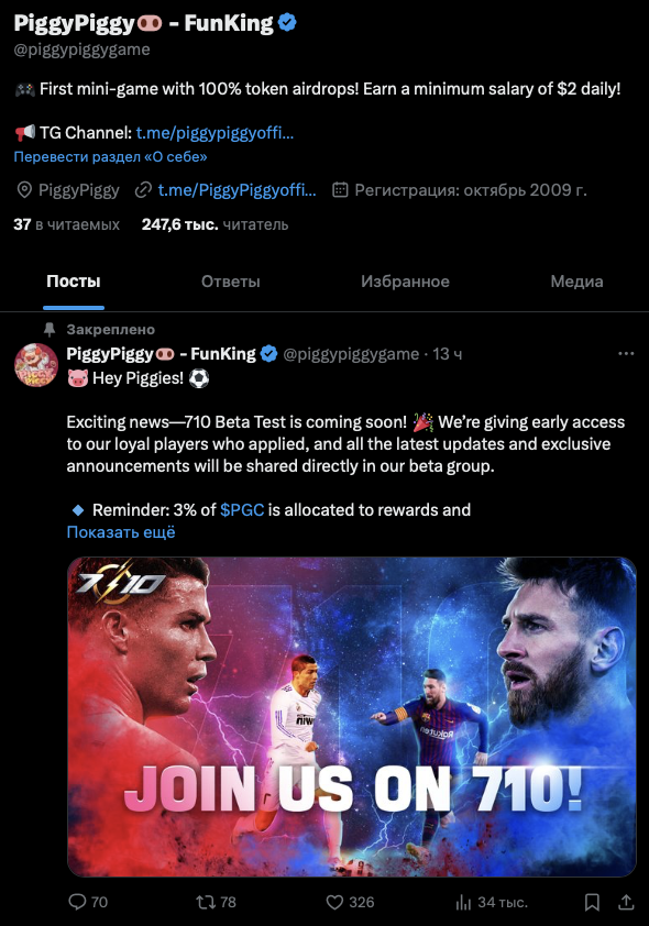 Кроме ТГ-канала, у проекта Piggy Piggy есть аккаунт в Twitter. На эту страницу подписано около 247,6 тысяч пользователей. За сутки после публикации пост собирает примерно 40-50 тысяч показов.
