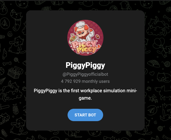 Чтобы начать играть в телеграмм-тапалку «Пигги Пигги», нужно сначала зайти в telegram-bot Piggy Piggy – PiggyPiggyofficialbot. После этого в чат tg-бота Piggy Piggy поступит приветственное сообщение.