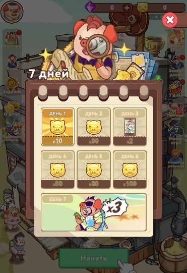 Раз в день при входе в ТГ-игру Piggy Piggy будет всплывать окошко с предложением забрать Daily Reward. Чтобы получить награду, нужно нажать на активное окошко. Затем следует кликнуть по значку крестика, чтобы закрыть форму.