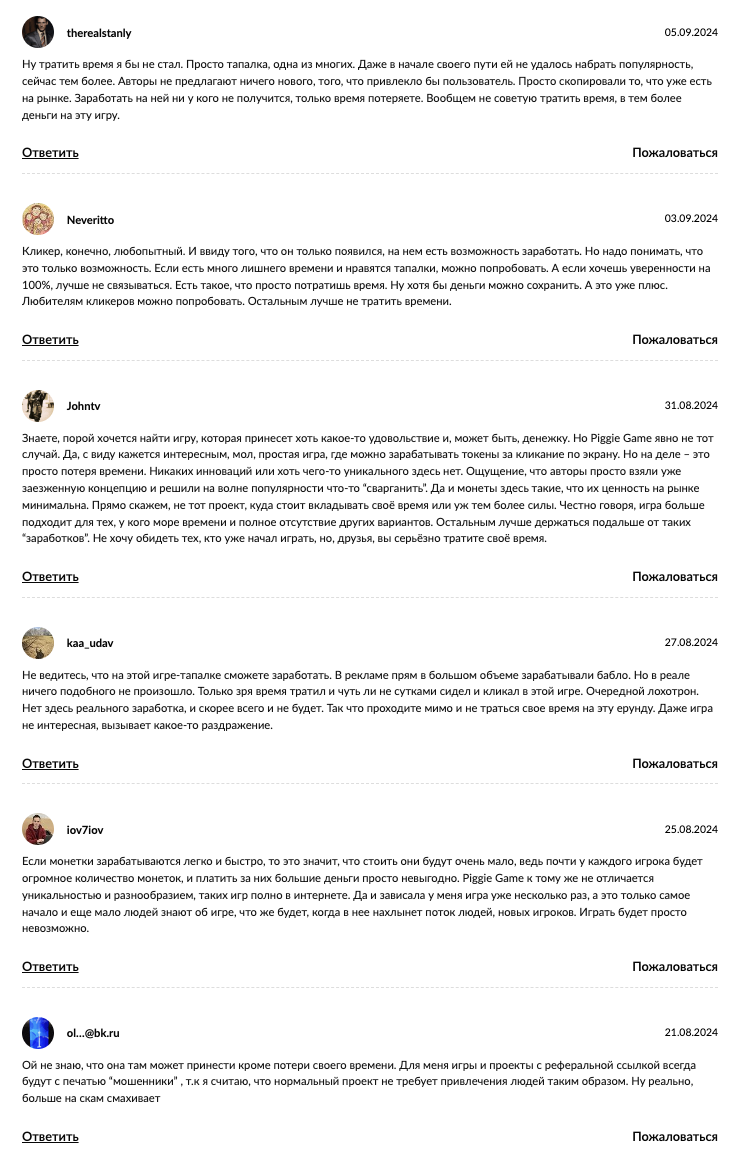 Отзывы об игре Piggy Piggy в интернете преимущественно скептичные. Пользователи не верят, что данная игра способна принести сколько-нибудь ощутимый доход. Поэтому они выражают мнение, что игра в «Пигги Пигги» – это пустая трата времени.