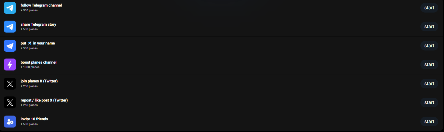 Задания достаточно простые — подписаться и пригласить друзей. Ни одного приложение не хочет рекламировать в игре в Телеграм Planes.