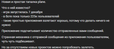 После того, как пользователь пройдет вступительное требования, игра Plane даст определенное количество самолетиков. Как пишут разработчики, число зависит от сообщений в Telegram. Чем больше общается пользователь — тем больше будет самолетиков. Скорее всего, это маркетинговый трюк, и приложение смотрит на возраст аккаунта.