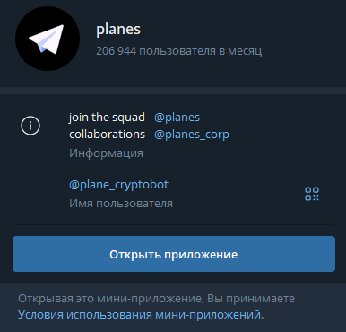 Обзор тапалки planes нужно начинать с общей информации. Игра работает через planecryptobot в Telegram — @plane_cryptobot.