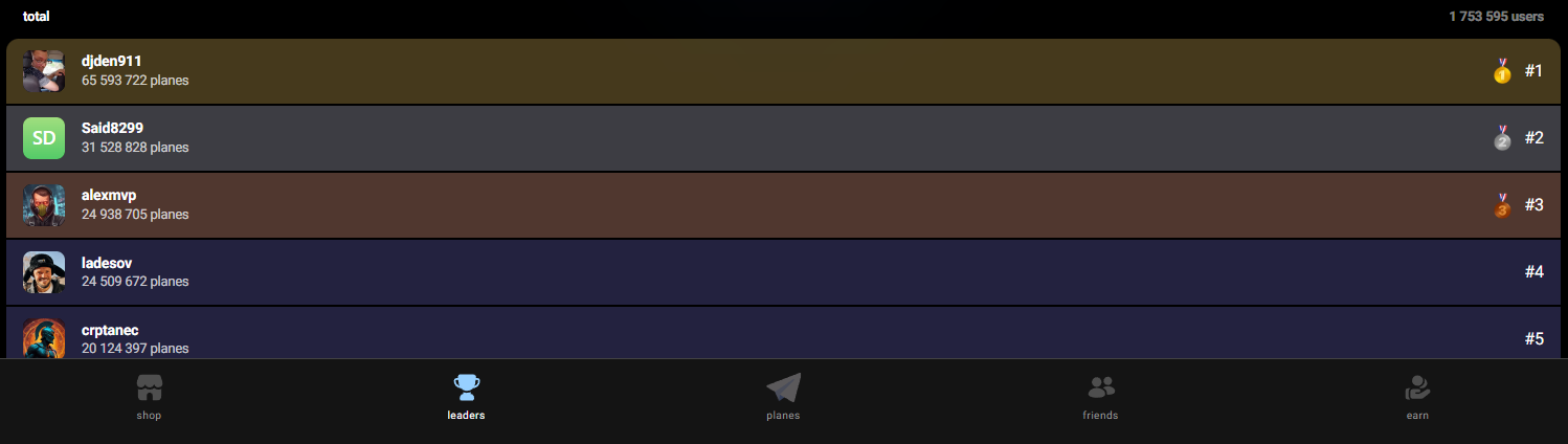 Для отслеживания прогресса есть таблица лидеров. Нахождение в ТОПе не дает ничего. Каким-то образом лучший игрок planes cryptobot в TG спустя 18 дней после запуска приложения уже заработал 65 миллионов самолетиков.