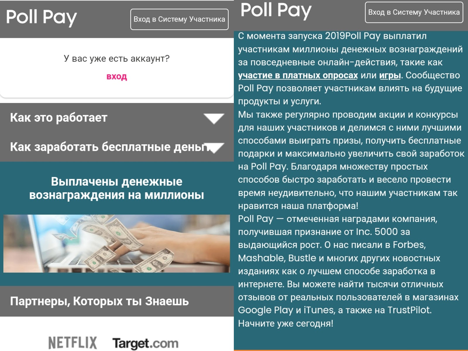Основатели рассказывают о том, что Pollpay работает с 2019 года и позволяет легко получать прибыль. Как добавлено, сервис получил много наград, и о нем упоминали в Форбсе и других известных изданиях. Из партнеров проекта отмечены: Нетфликс, Волмарт и прочие. Сами организации не подтверждали связи с ПоллПэй. При этом имена руководителей компании скрыты, как и любые упоминания о других сотрудниках. Своими планами по улучшению функционала площадки основатели не поделились. На сайте написано, что было выплачено миллион денежных вознаграждений, но верифицированной отчетности по работе проекта нет.