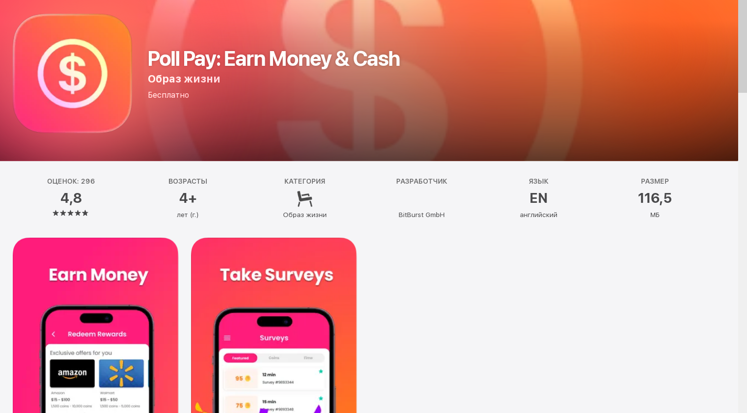 Poll Pay позволяет пройти различные опросы, за которые основатели обещают от 50 до 500 коинов. Как обозначено, каждый опрос занимает 3-25 минут. Помимо этого, предлагаются награды за прохождение уровней в определенных играх, а также на возврате денег за покупки на маркетплейсе. Например, за активности на Амазоне обещают около 1 500 монет, а за активности на Волмарт до 5 тыс. Узнать полноценные условия о начислении прибыли можно только после регистрации.