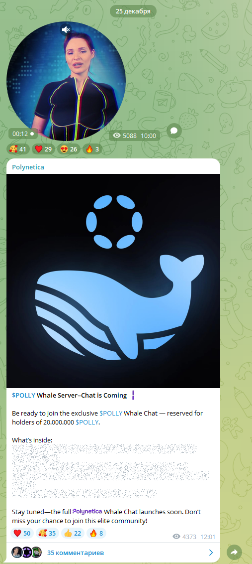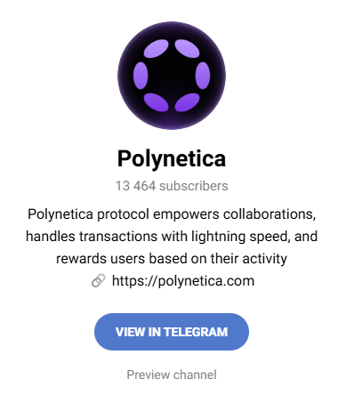 У проекта имеется телеграмм-канал о крипте Polynetyca с одноименным ником. На него подписано чуть менее 12 тысяч человек. Посты посвящены новостям проекта, набирают по несколько тысяч просмотров. Комментарии и реакции открыты.