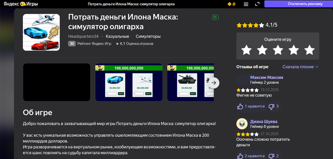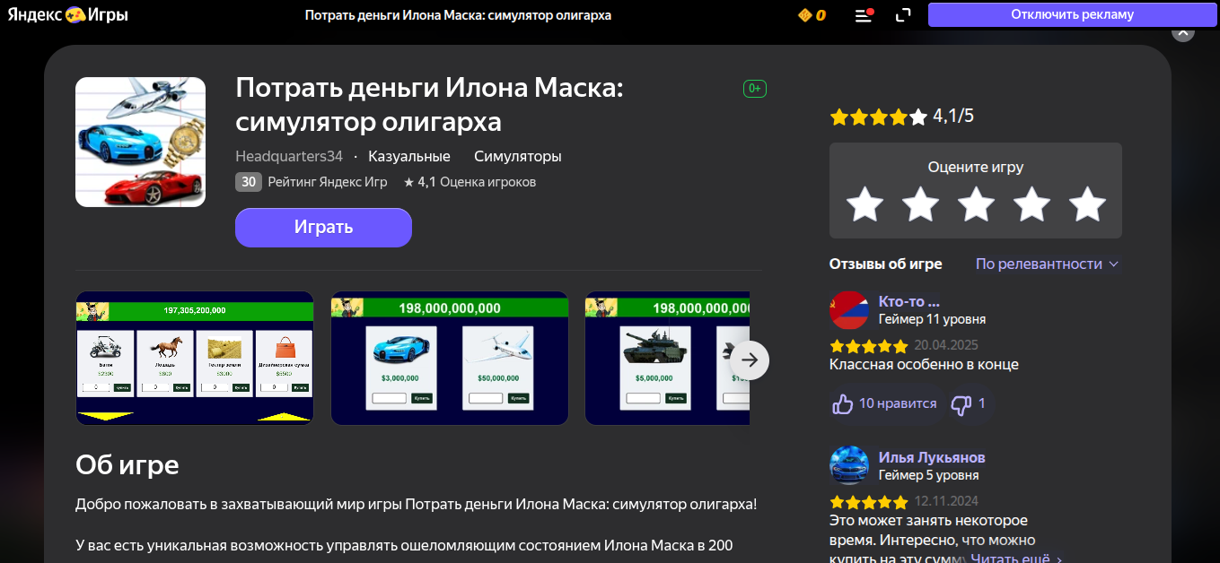 Отзывы о симуляторе олигарха «Потратить Деньги Илона Маска»
