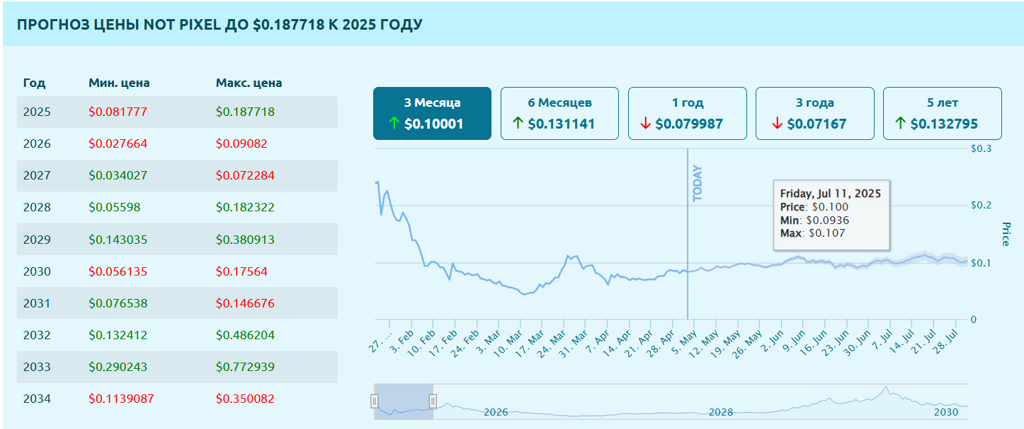 На данный момент крипта выглядит перспективной. Ожидается, что в следующем году ее стоимость увеличится в 3 раза, а к 2034 году составит 0,35 доллара. Сколько будет стоить Нот Пиксель следующие 9 лет, можно посмотреть на графике ниже.