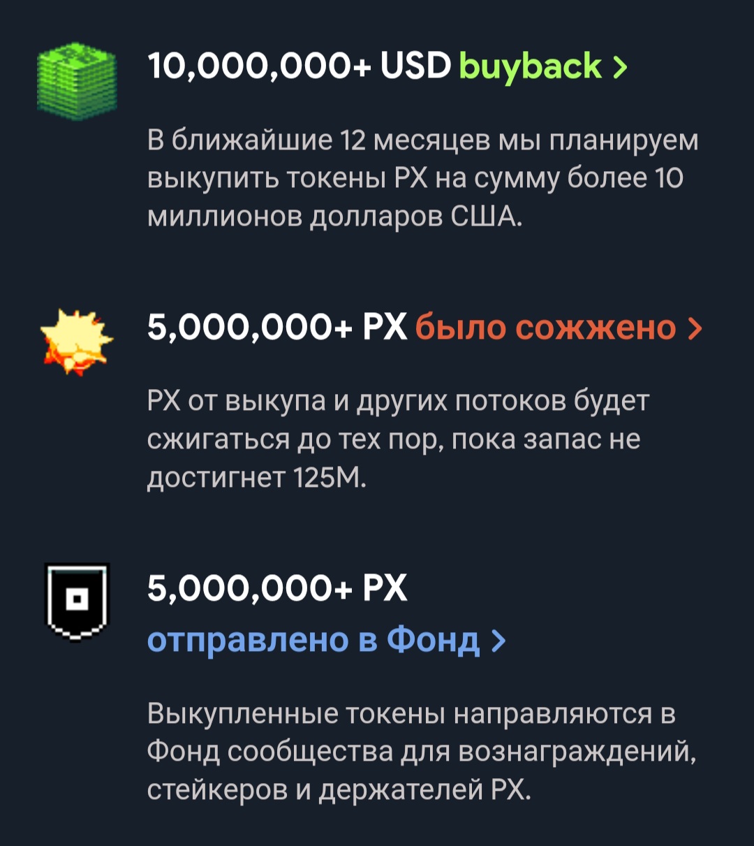 Ожидается, что токен PX будет выведен на другие крупные централизованные биржи, включая Binance, Bybit, OKX, HTX, но ориентировочные сроки не приводятся. Листинг на других криптовалютных платформах может повысить ликвидность и узнаваемость монеты.