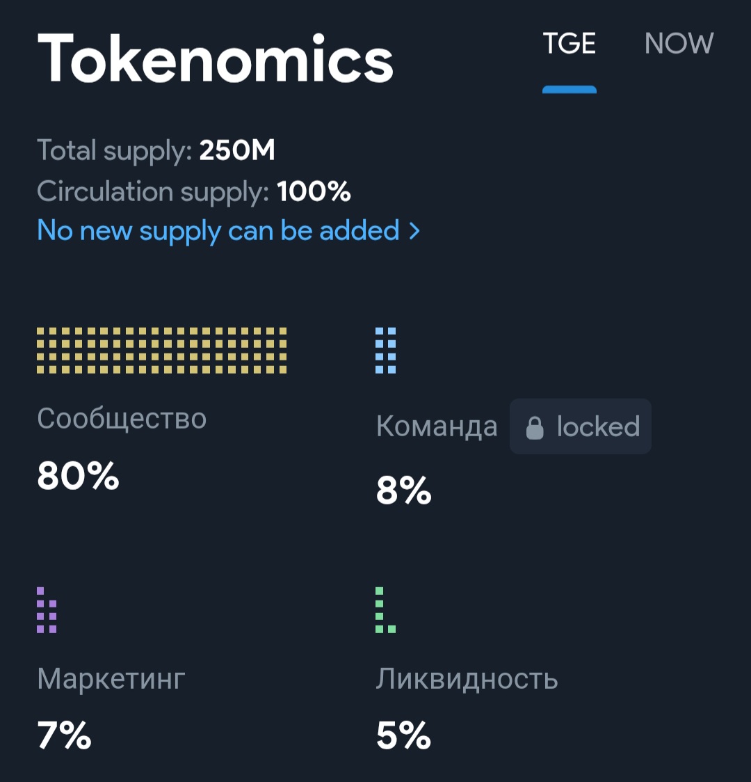 ​Токен Not Pixel (PX) представляет собой внутриигровую валюту проекта Not Pixel, основанную на блокчейне TON и разработанную для поощрения активности игроков, поддержки роста сообщества.​ Всего было выпущено 250000000 монет, из который 80% было направлено на участников проекта, 8% получила команда, а 7% ушло на маркетинг. На ликвидность на биржах было выделено 5%, а 5000000 токенов было сожжено. Разработчики планируют периодически сжигать PX до тех пор, пока не останется 125000000 монет.