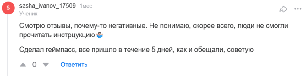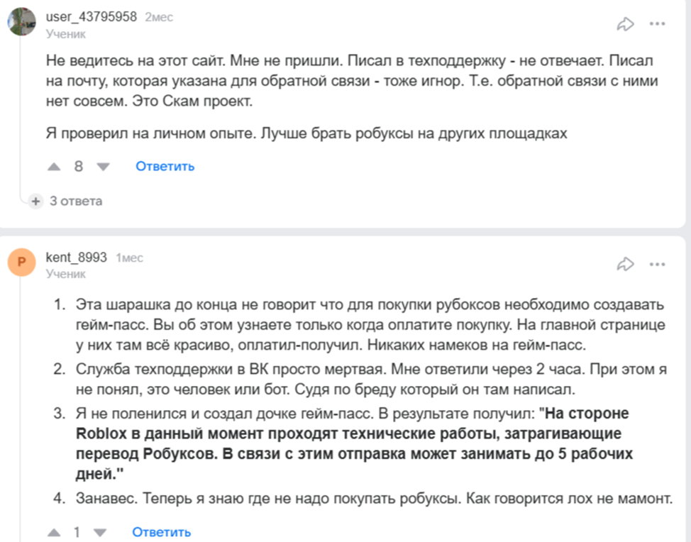 Подтверждением, что это скам-проект, служат отзывы. Пользователи не рекомендуют приобретать Робуксы через этот сайт, поскольку там обманывают клиентов. Проект считается ненадежным, ведь не получается приобрести цифровую валюту. Пользователи не советуют обращаться на сайт и в Тгк. Но встретился и положительный отзыв. Пользователь отмечает, что нужно читать инструкцию и делать геймпасс, и тогда все отлично работает.
