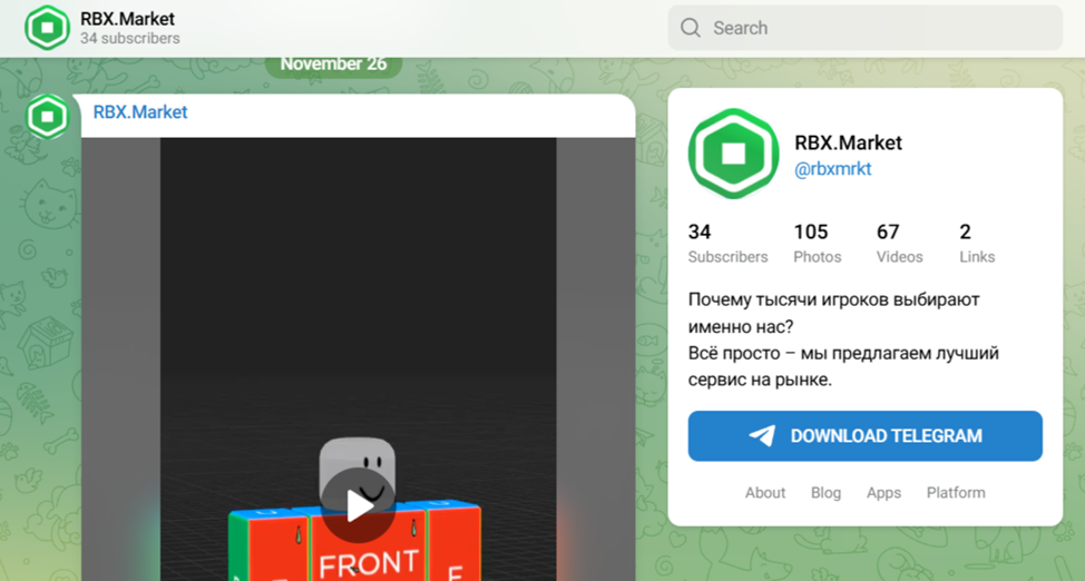 У этого сайта есть канал в Телеграме. Там всего 34 подписчика, которые следят за постами сообщества. На этом канале регулярно выходят публикации и видео. Там можно найти актуальную информацию, связанную с работой основного сервиса, где продают и покупают Робуксы.