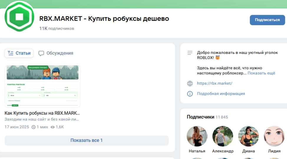 Кроме канала в Телеграме, есть сообщество в VK. Там более 11000 подписчиков, но активность небольшая. Посты просматривает не так много пользователей. В сообществе регулярно выходили публикации, но в последнее время администраторы сообщества не ведут активную деятельность. Основной контент площадки связан с Робуксами.