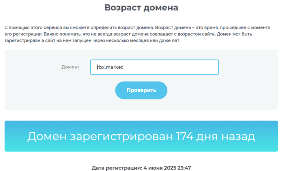 Мы внимательно проверили сервис Rbxmarkett и узнали все особенности его работы. Сайты, где производятся финансовые расчеты, обязательно должны иметь лицензию. Мы узнали, что у этой платформы отсутствует разрешение от Центрального Банка РФ, поэтому ее деятельность незаконная. Никакие другие документы на сайте не представлены.Теперь проверим срок работы сервиса Rbxmarkett. Внизу сайта указан год – 2025. Проверка показала, что домен зарегистрирован 04.06.2025 г. Значит, разработчики площадки предоставили достоверную информацию. Но небольшой срок работы свидетельствует о неопытности, поэтому важно настороженно относиться к этой платформе.