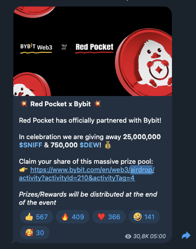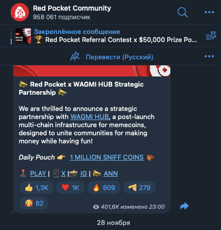 На телеграмм-канал Red Pocket Community, redpocketgame, на 12 декабря 2024-го года, подписано около 958 тысяч пользователей. Публикации собирают в среднем 300-400 тысяч показов.