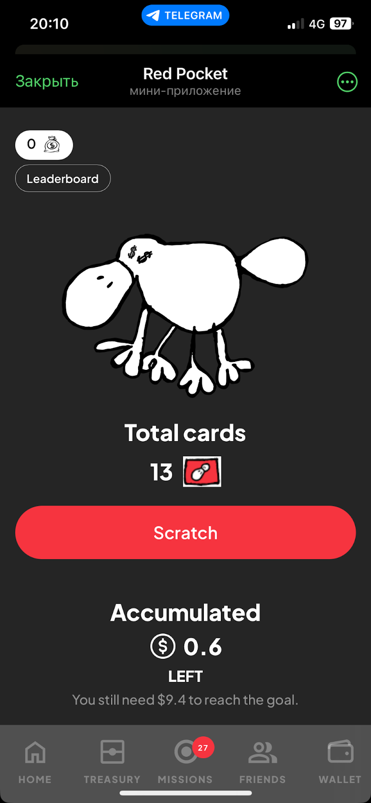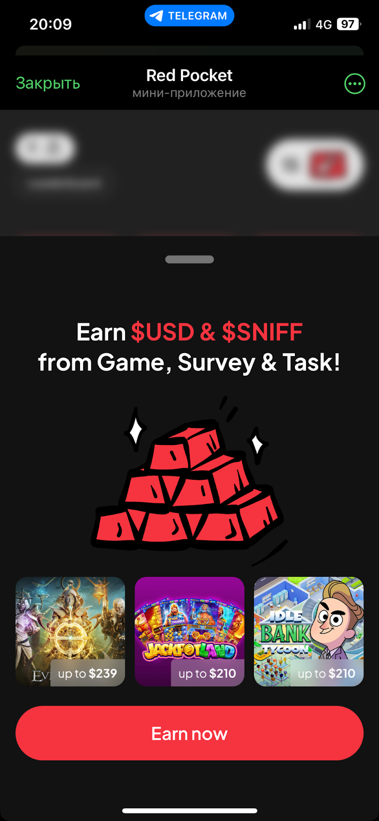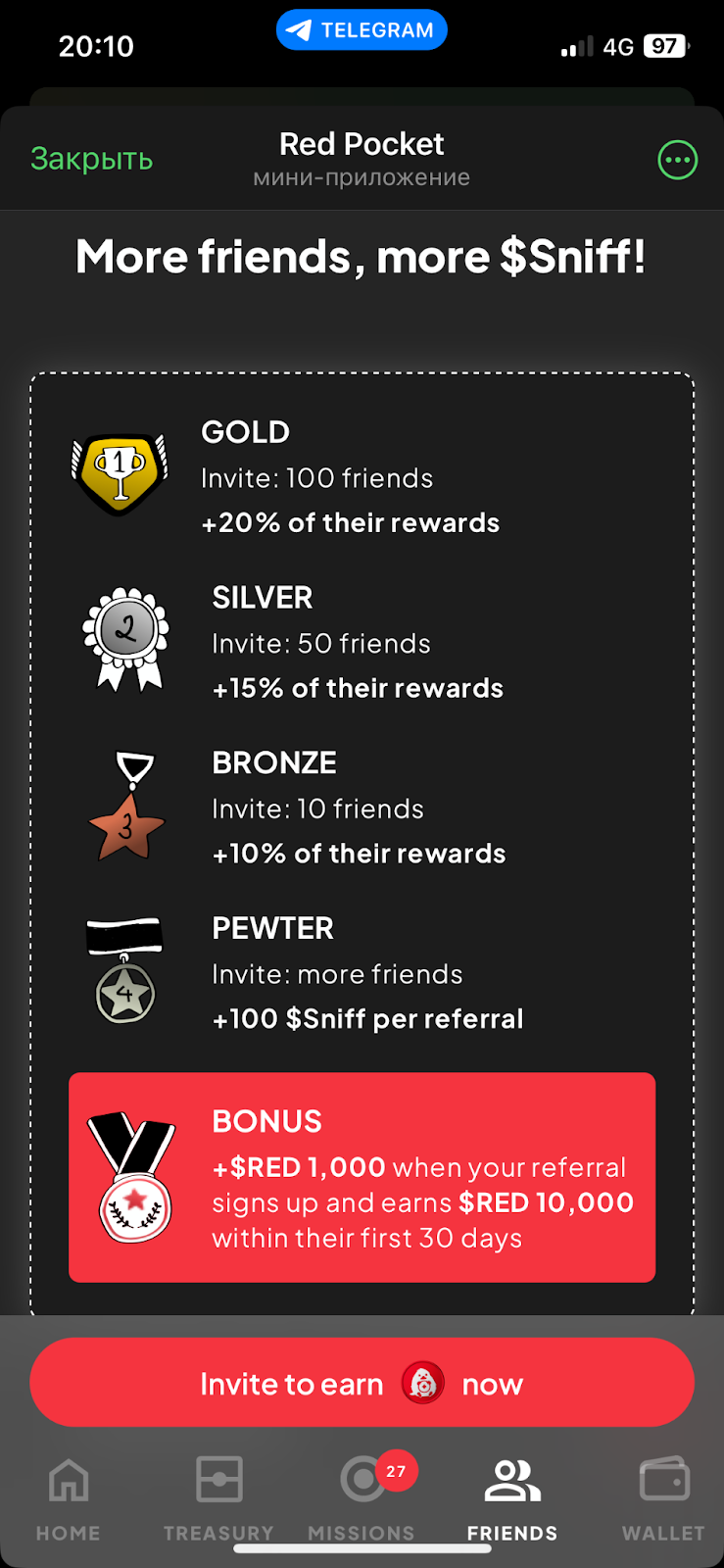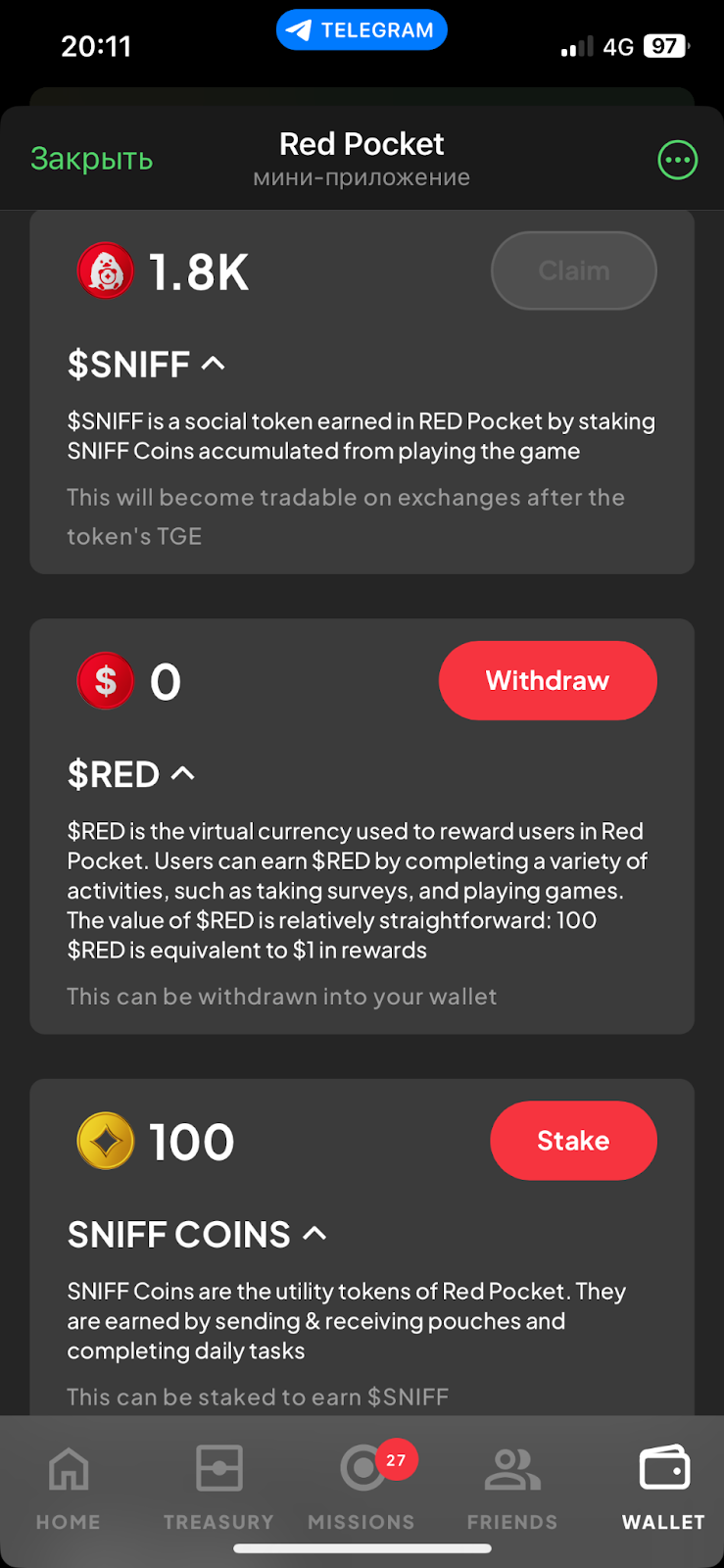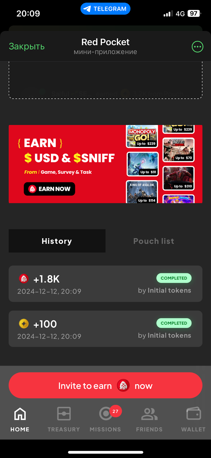 В telegram-игре Red Pocket есть система заданий. Список актуальных задач, за которые можно получить награды, находится в разделе Missions.