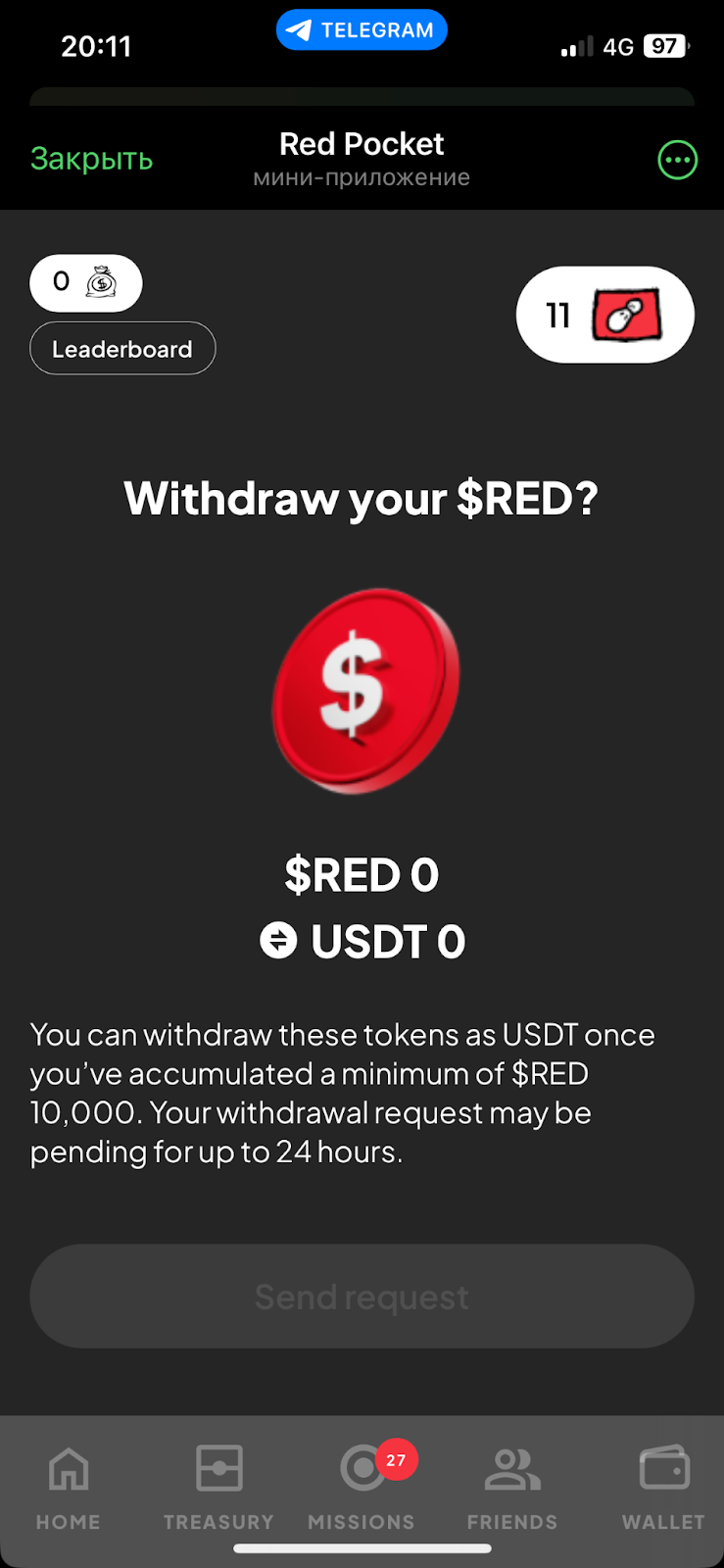 На 12 декабря 2024-го года вывести можно только токены RED. Чтобы их получить, необходимо накопить на балансе минимум 10 тысяч монеток.