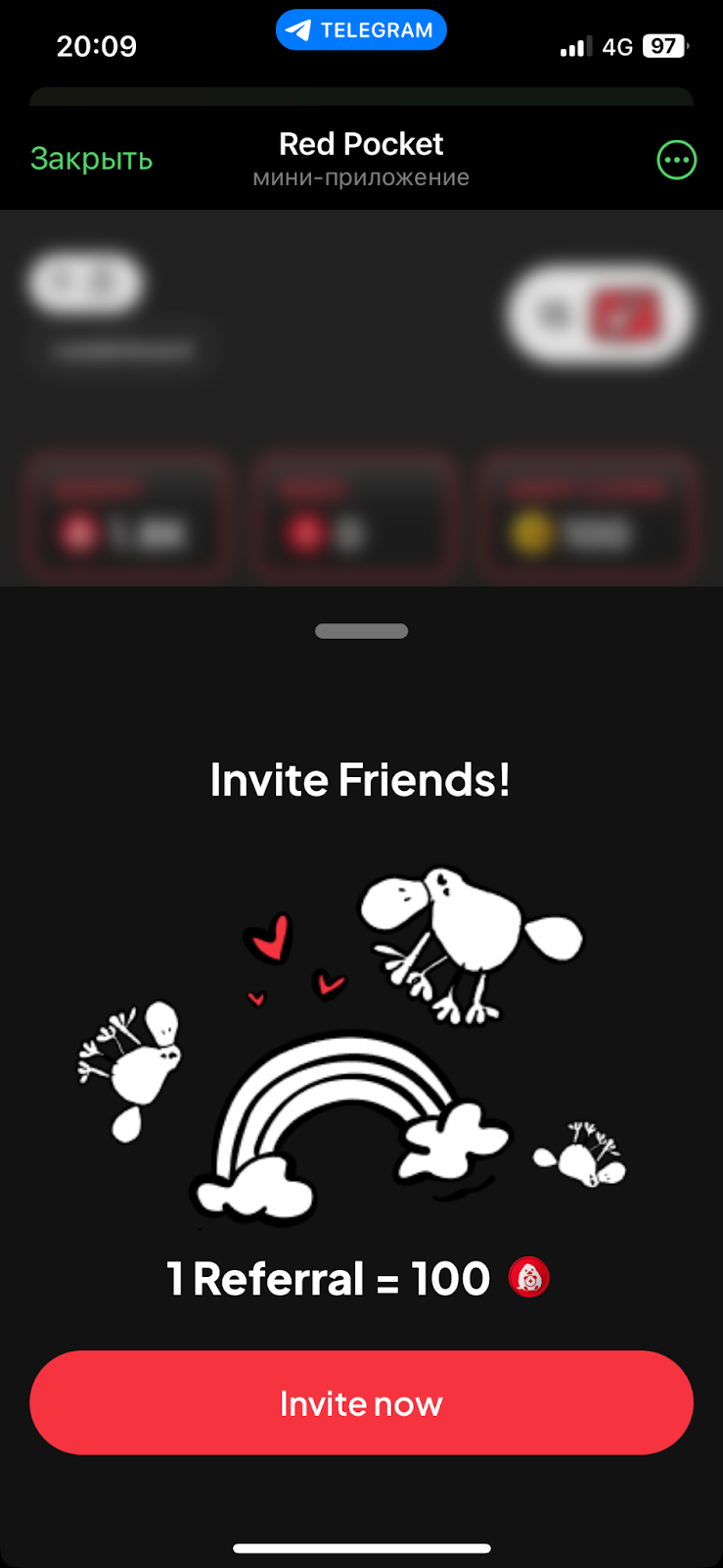 После того, как мы нажали на Claim now, появилось модальное окно. В нем нам рассказали, что награда за приглашение одного нового пользователя составит 100 монет.