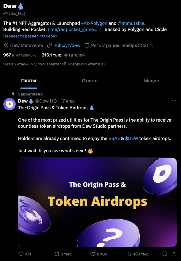 Также мы нашли аккаунт разработчиков в Twitter – Dew HQ. На него подписано около 316 тысяч читателей. Публикации собирают в среднем 300-400 показов.