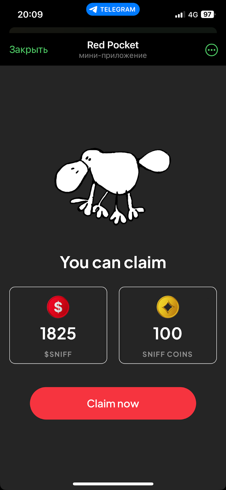 После того, как мы зашли в игру со смартфона, нам показали экран с приветственными подарками. На аккаунте с шестилетней историей и без подключенного Telegram Premium награда составила 1825 $SNIFF и 100 SNIFF COINS.