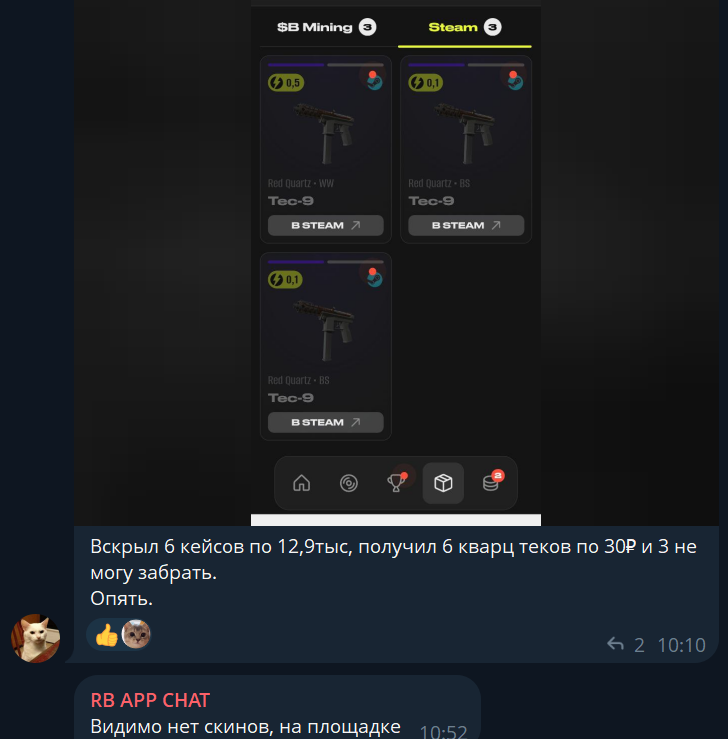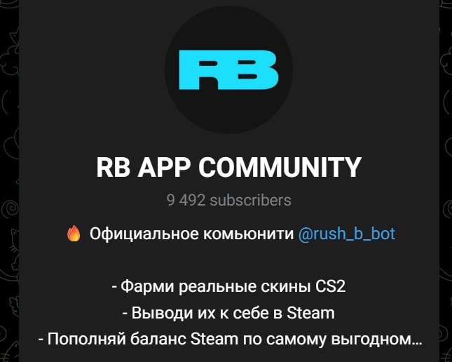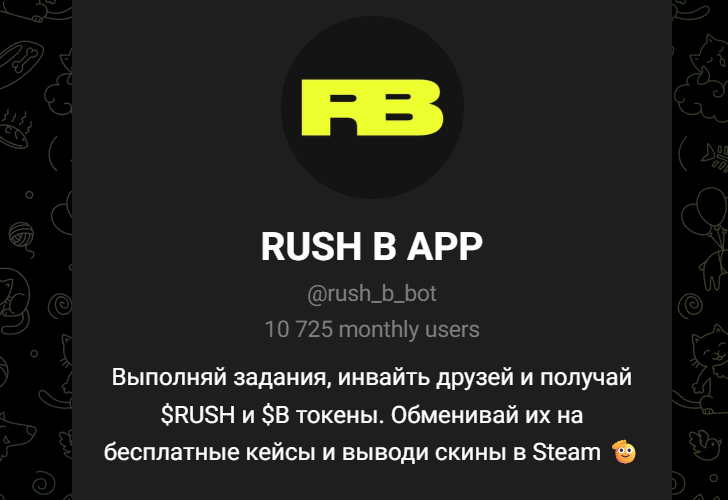 Пользователям Rush b bot открывает мини-приложение, где можно получать монеты для работы. Одним из обязательных условий является привязка стим-аккаунта к данной платформе, что уже выглядит не очень безопасно и надежно. Пользователям обещают ежедневно разыгрывать различные кейсы, которые они могут получить бесплатно. В каждом кейсе есть шанс получить редкие предметы для игр, но такой шанс выпадения является относительно невысоким. Ботом пользуется более 11 тысяч пользователей в месяц, что говорит о достаточно высокой популярности.