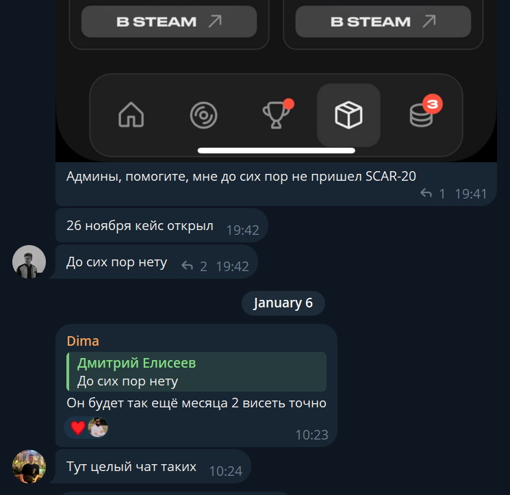 О боте Rush b bot отзывы встречаются не часто, но за последний период есть много жалоб, что не удается вывести скины. Люди обращаются к администрации, но им не удается увидеть обещанные предметы на своем аккаунте. Люди ставят на вывод и ждут по несколько месяцев, так и не получив вещи. Ранее пользователи жаловались на комиссию в 30%, которая не была указана. В итоге, потери финансов составляли больше, чем предполагалось, а некоторые так и не получили скины.