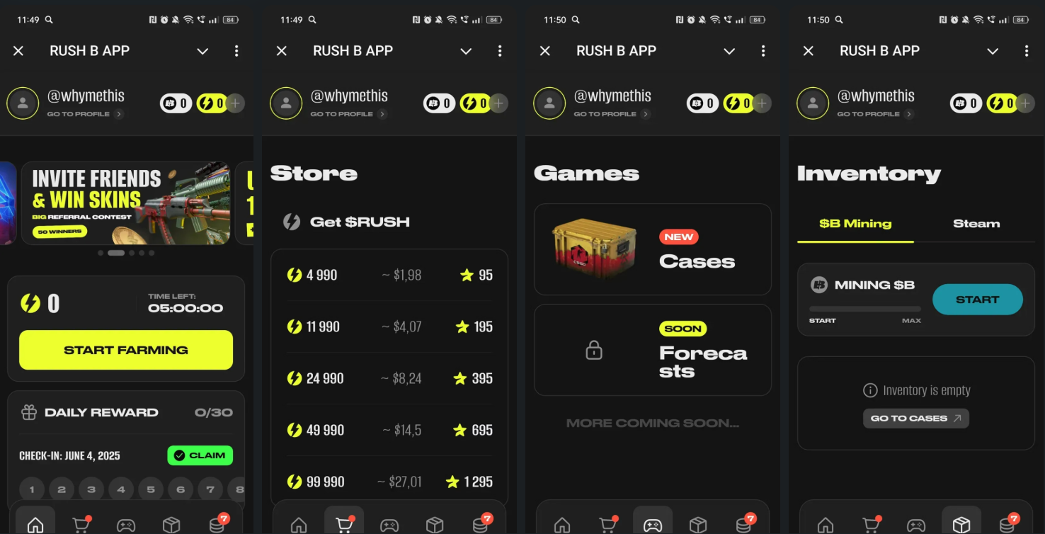 Пользователи Rush b app могут заниматься фармингом токенов $Rush, которые могут пригодиться для получения скинов в «Steam». Делать это можно сделать через специальный бот, открывающий мини-приложение в Телеграме. Здесь игроки получают возможность практически бесплатно получить много бонусов в виде косметических и прочих улучшений для своего аккаунта. В этой статье мы рассмотрим, действительно ли бот позволяет получить криптовалюту и обменивать ее на кейсы и скины или это развод.