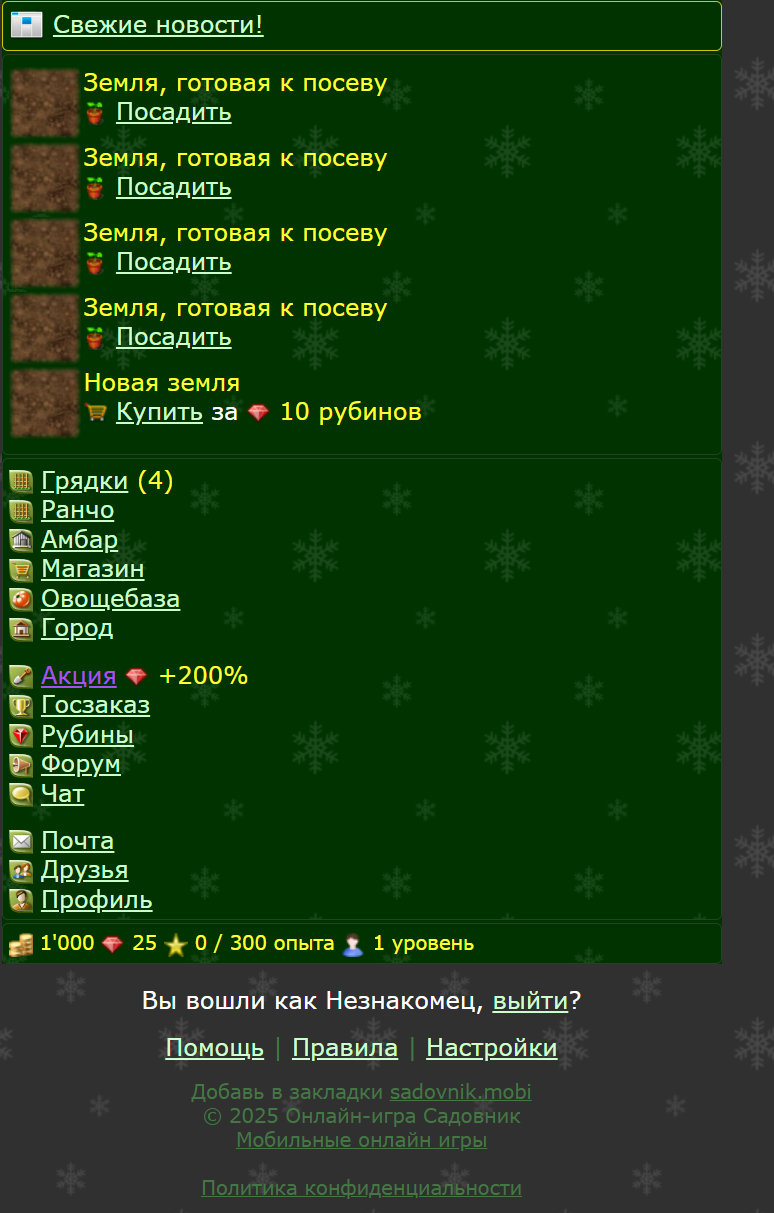 Игра «Садовник» является стратегией с фермерской тематикой. После регистрации пользователь получает виртуальную ферму, где занимается посадкой растений, удобрением и сбором урожая.