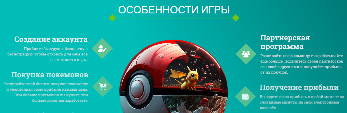 Чем дороже покемон, тем выше его доходность. Пользователи должны зарегистрироваться на сайте, пополнить баланс (минимальная сумма – 50 рублей) и приобрести покемонов, чтобы начать зарабатывать.