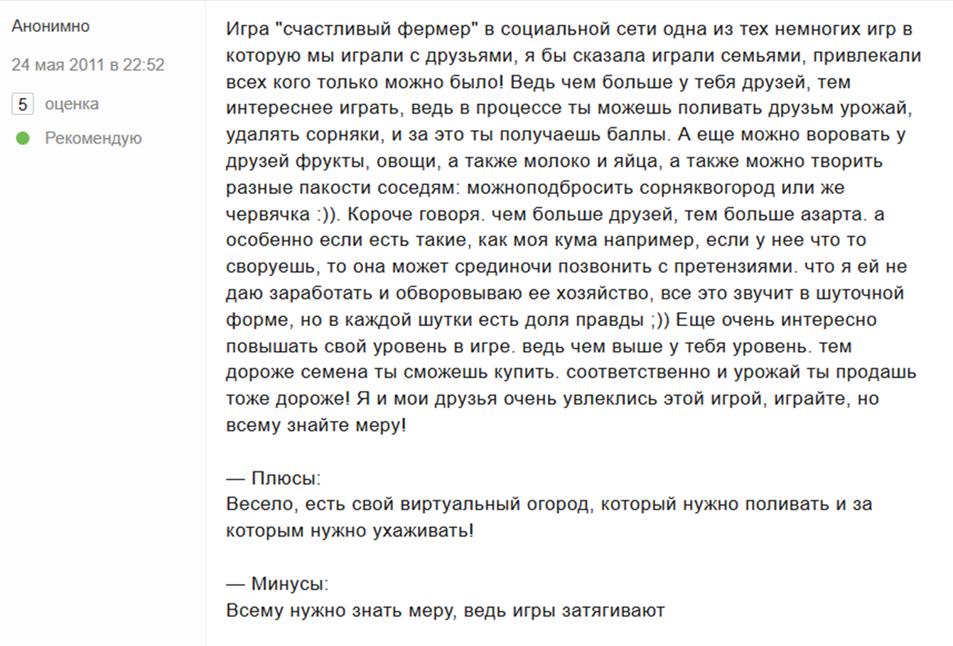 Все отзывы на «Счастливый фермер» датируются 2010-2016 годом. Положительные мнения оставлены пользователями, которые рассматривали проект не для заработка, а для развлечения.