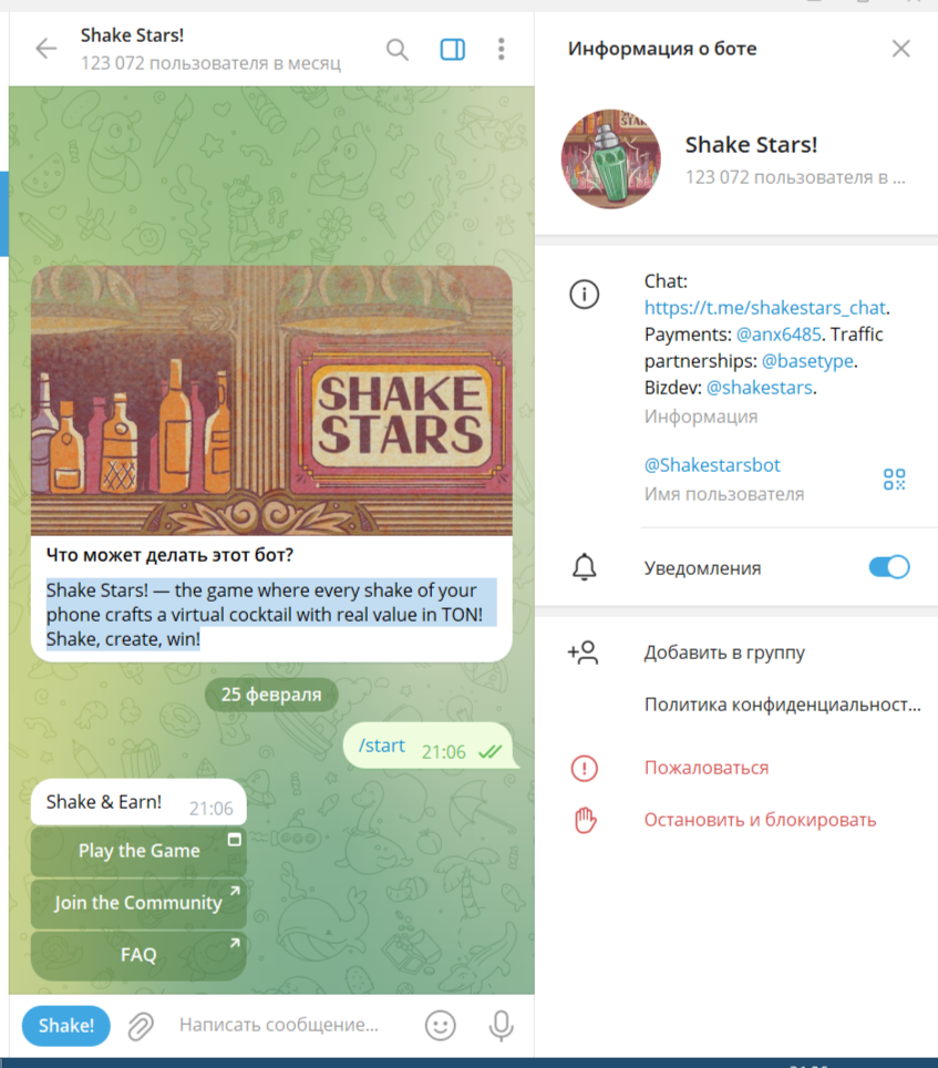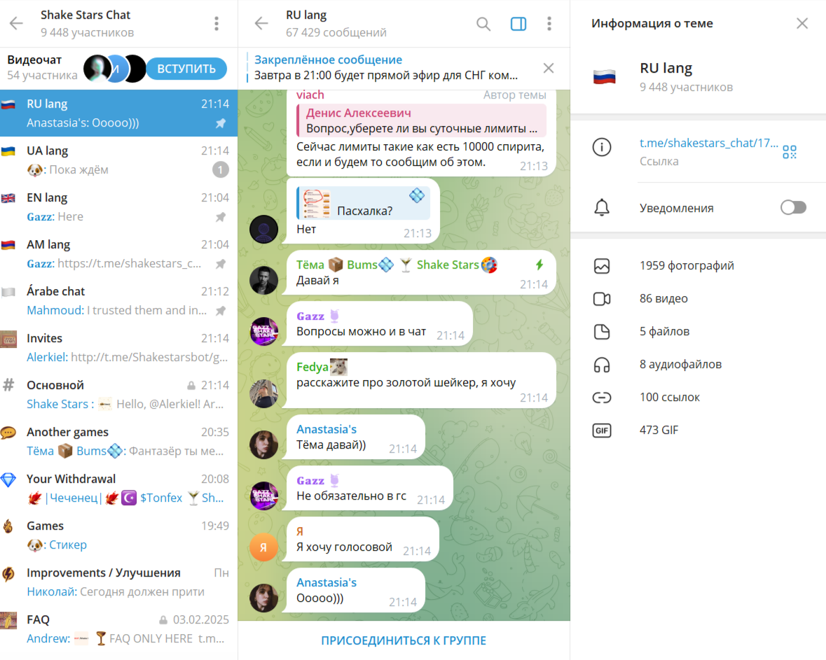 Как уже говорилось выше, игра запускается через shake stars бот в ТГ. Разработчики заявляют, что к ним присоединилось более 250 000 игроков. Однако статистика бота показывает, что активных пользователей всего 126 тысяч. К выбору доступно несколько языков: русский, английский, украинский, армянский. Большая часть аудитории – русскоязычная. Админы часто проводят розыгрыши, ведут прямые эфиры. Авторы не афишируют свои личности.