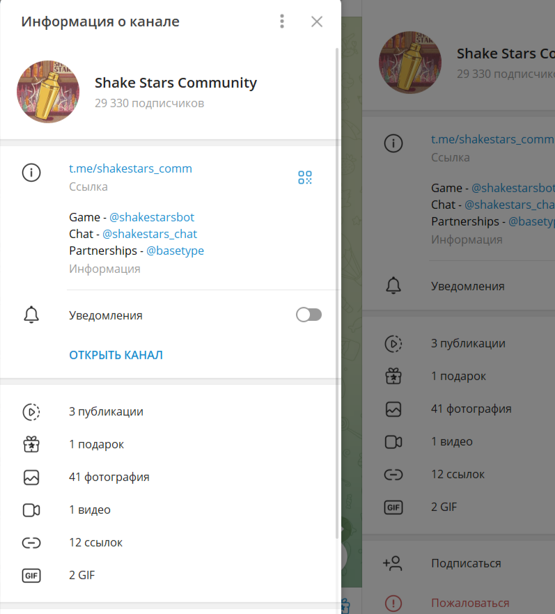 Новостной канал Shake Stars Community был создан 5 ноября 2024 года. Контент состоит из анонсов обновлений, приглашений на конкурсы и стримов. Иногда встречаются рекламные ссылки других проектов. Публикации в основном на английском языке. Аудитория почти 30 тысяч, при этом просмотры колеблются от 7 до 20 тысяч. Это достаточно неплохой показатель. Комментарии под постами отключены.