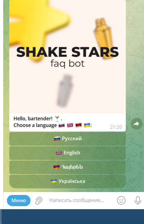 Для того, чтобы начать играть, нужно запустить бота shakestarsbot в Телеграме. Пользователю будет предложено несколько кнопок: