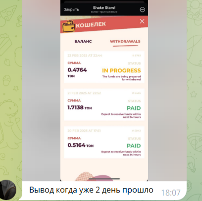Сюрприз поджидает игроков «Шейк Старс» при попытке вывести заработанные токены. Обязательным условием является наличие не менее 5 приглашенных друзей. Минимальная сумма вывода – 0,1 TON. Взимается ли комиссия за операцию – неизвестно. Админы утверждают, что деньги приходят на счет в течение 24 часов. Иногда вывод может задержаться на двое суток. Не проводятся транзакции в выходные и праздничные дни.