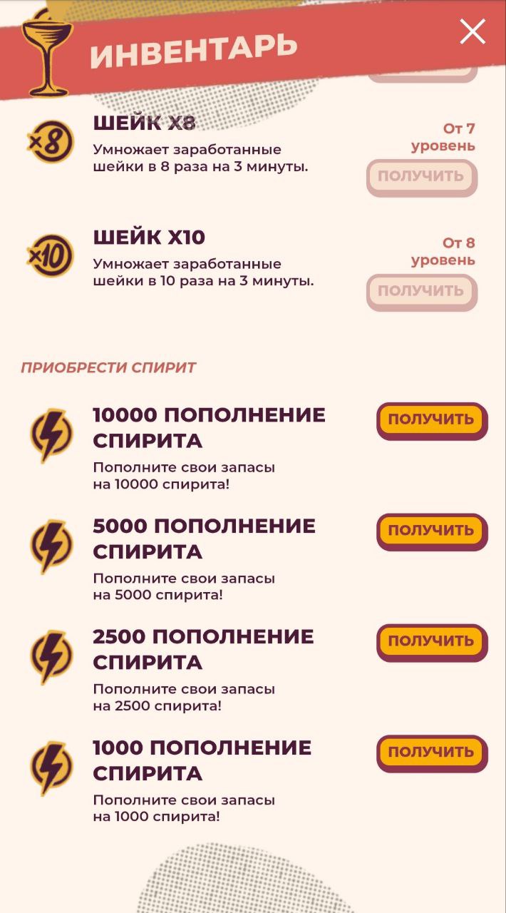 По сравнению с другими играми, энергия здесь не восполняется. Получить необходимую субстанцию можно в инвентаре. К выбору доступна покупка спирита за звезды или токены TON. Некоторое количество энергии можно раздобыть выполняя задания. В основном это просмотр рекламы и подписка на различные телеграм-проекты. Больше всего составляющего для коктейля можно получить приглашая друзей в игру.