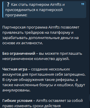 OnliElizaNi направляет участников в телеграм-бот Ascendex. Этот бот называют торговой платформой для NFT. Внутри он называется Airnfts. Выглядит вполне прилично на первый взгляд.