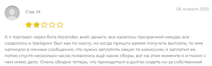 Другой пользователь тоже торговал через бота Ascendex. Внес деньги в январе 2025 года. Трейдинг шел как по маслу. Все казалось прозрачным. Даже прибыль показывали. При попытке вывода денег началась карусель. Сначала комиссия. Потом страховой взнос. Затем налог на прибыль. И так до бесконечности. Деньги остались у мошенников.